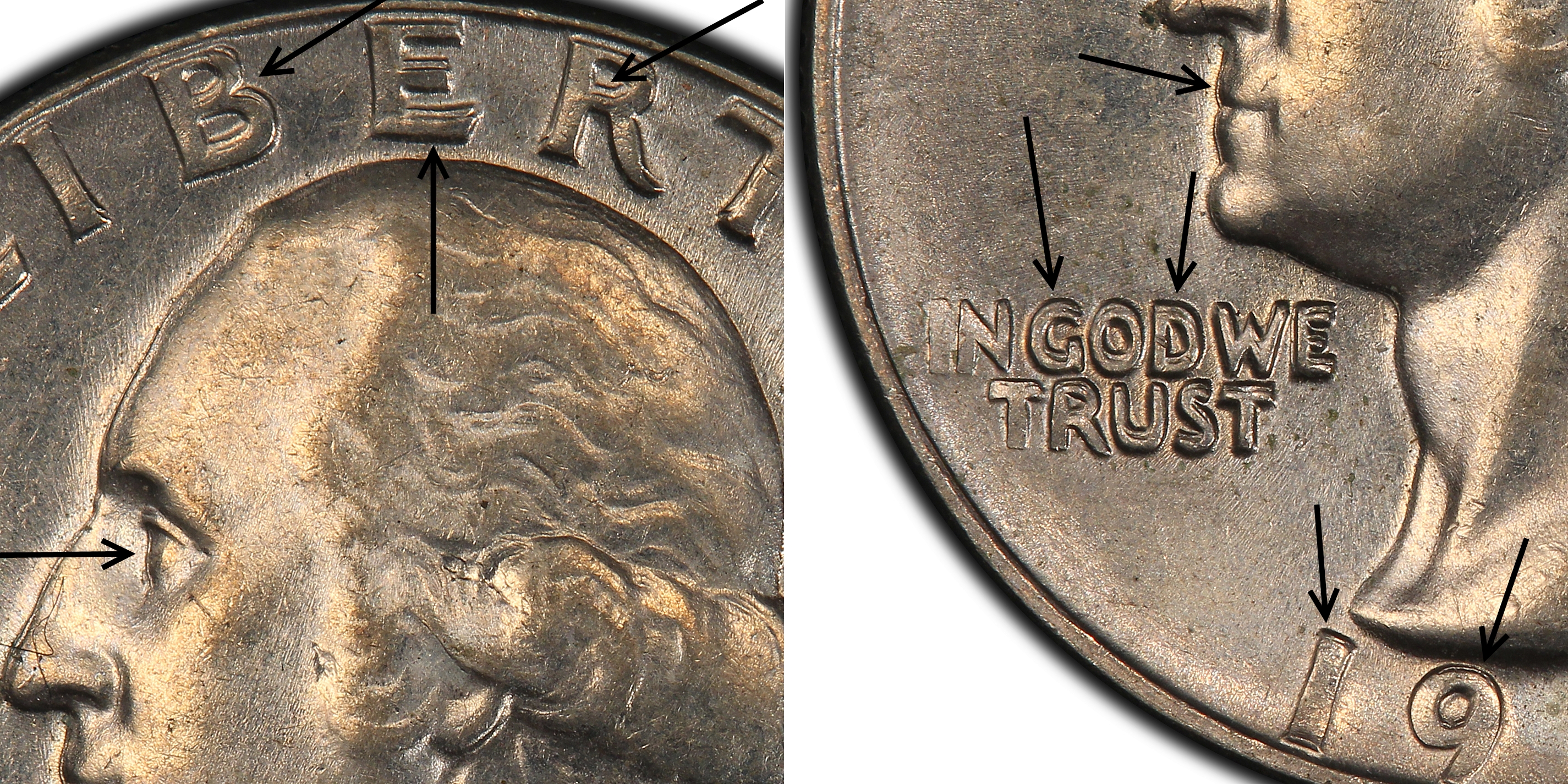 Focus your examination on the eagle's details and the lettering around it using strong magnification. Strong DDR varieties will show clear notching or complete doubling of letters, particularly visible on "QUARTER DOLLAR" and "UNITED STATES OF AMERICA." The eagle's feathers, breast shield, and arrows can also show doubling effects. Look for separation between doubled elements rather than simple doubling that could be from other causes. Compare the lettering closely - true doubled dies will show distinct notches on letters like "E," "R," "A," and "D." The most valuable examples display dramatic doubling across multiple design elements. Reference known DDR varieties in variety guides and attribution resources. Remember that doubling should be consistent and appear as part of the strike, not as damage or wear on the coin's surface.